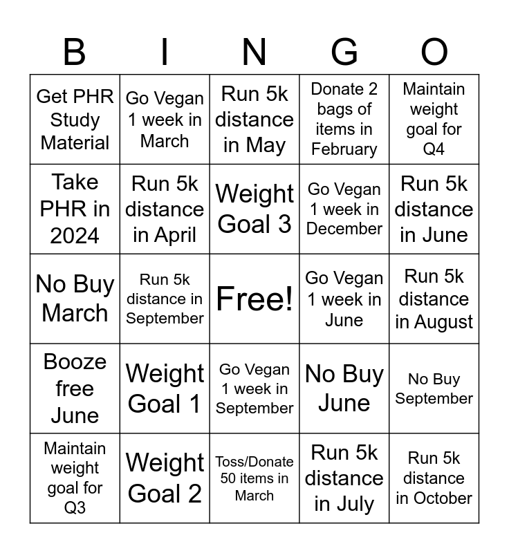 This bingo card has a free space and 24 words: Weight Goal 1, Weight Goal 2, Weight Goal 3, Maintain weight goal for Q3, Maintain weight goal for Q4, Get PHR Study Material, Take PHR in 2024, Go Vegan 1 week in March, Go Vegan 1 week in June, Go Vegan 1 week in September, Go Vegan 1 week in December, No Buy March, No Buy June, No Buy September, Run 5k distance in April, Run 5k distance in July, Run 5k distance in August, Run 5k distance in May, Run 5k distance in June, Run 5k distance in September, Run 5k distance in October, Booze free June, Donate 2 bags of items in February and Toss/Donate 50 items in March.