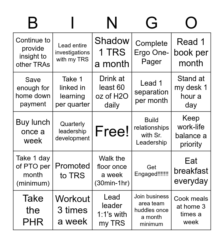 This bingo card has a free space and 24 words: Promoted to TRS, Workout 3 times a week, Drink at least 60 oz of H2O daily, Take the PHR, Read 1 book per month, Continue to provide insight to other TRAs, Save enough for home down payment, Lead entire investigations with my TRS, Build relationships with Sr. Leadership, Walk the floor once a week (30min-1hr), Lead 1 separation per month, Buy lunch once a week, Get Engaged!!!!!!!, Eat breakfast everyday, Take 1 linked in learning per quarter, Join business area team huddles once a month minimum, Keep work-life balance a priority, Shadow 1 TRS a month, Stand at my desk 1 hour a day, Quarterly leadership development, Cook meals at home 3 times a week, Take 1 day of PTO per month (minimum), Complete Ergo One-Pager and Lead leader 1:1's with my TRS.