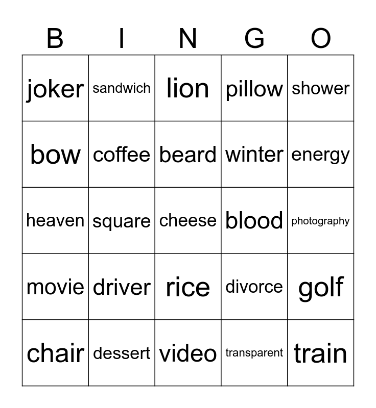 This bingo card has 25 words: driver, video, beard, chair, shower, joker, bow, sandwich, blood, rice, winter, heaven, divorce, golf, coffee, train, photography, lion, energy, square, cheese, dessert, movie, pillow and transparent.