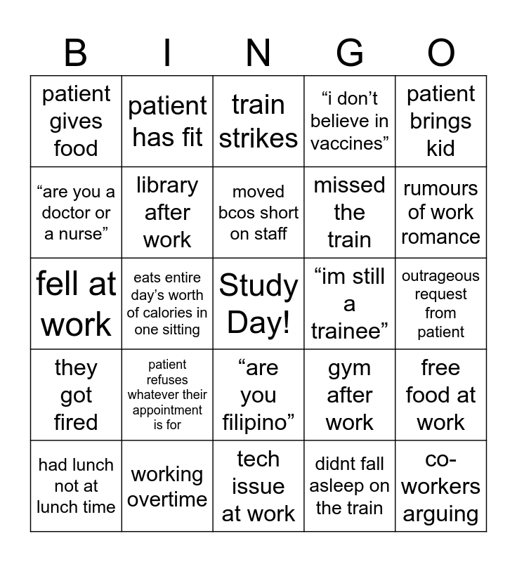 This bingo card has a free space and 24 words: patient refuses whatever their appointment is for, working overtime, moved bcos short on staff, had lunch not at lunch time, patient brings kid, patient gives food, “are you a doctor or a nurse”, patient has fit, “im still a trainee”, “are you filipino”, missed the train, fell at work, gym after work, free food at work, library after work, didnt fall asleep on the train, outrageous request from patient, train strikes, rumours of work romance, eats entire day’s worth of calories in one sitting, co-workers arguing, they got fired, “i don’t believe in vaccines” and tech issue at work.