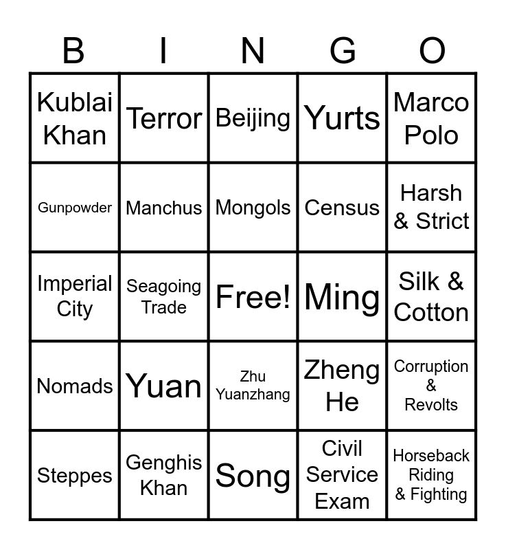This bingo card has a free space and 24 words: Yuan, Genghis Khan, Mongols, Steppes, Marco Polo, Kublai Khan, Gunpowder, Terror, Ming, Zhu Yuanzhang, Census, Imperial City, Zheng He, Corruption & Revolts, Manchus, Civil Service Exam, Silk & Cotton, Beijing, Harsh & Strict, Seagoing Trade, Horseback Riding & Fighting, Nomads, Yurts and Song.