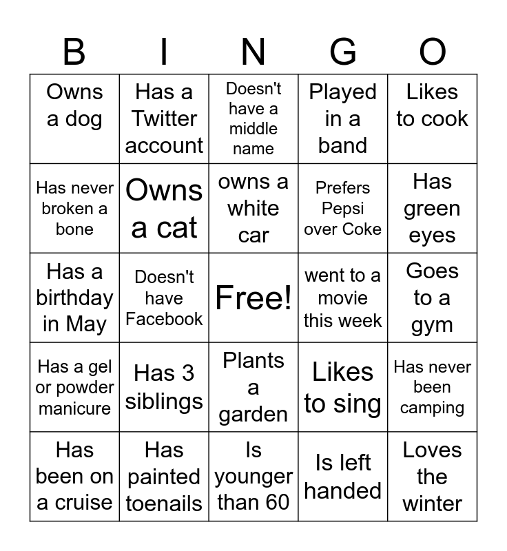 This bingo card has a free space and 24 words: Has 3 siblings, Has painted toenails, owns a white car, Has been on a cruise, Likes to cook, Owns a dog, Has never broken a bone, Has a Twitter account, went to a movie this week, Plants a garden, Prefers Pepsi over Coke, Has a birthday in May, Likes to sing, Has never been camping, Owns a cat, Is left handed, Goes to a gym, Doesn't have a middle name, Has green eyes, Doesn't have Facebook, Loves the winter, Has a gel or powder manicure, Played in a band and Is younger than 60.