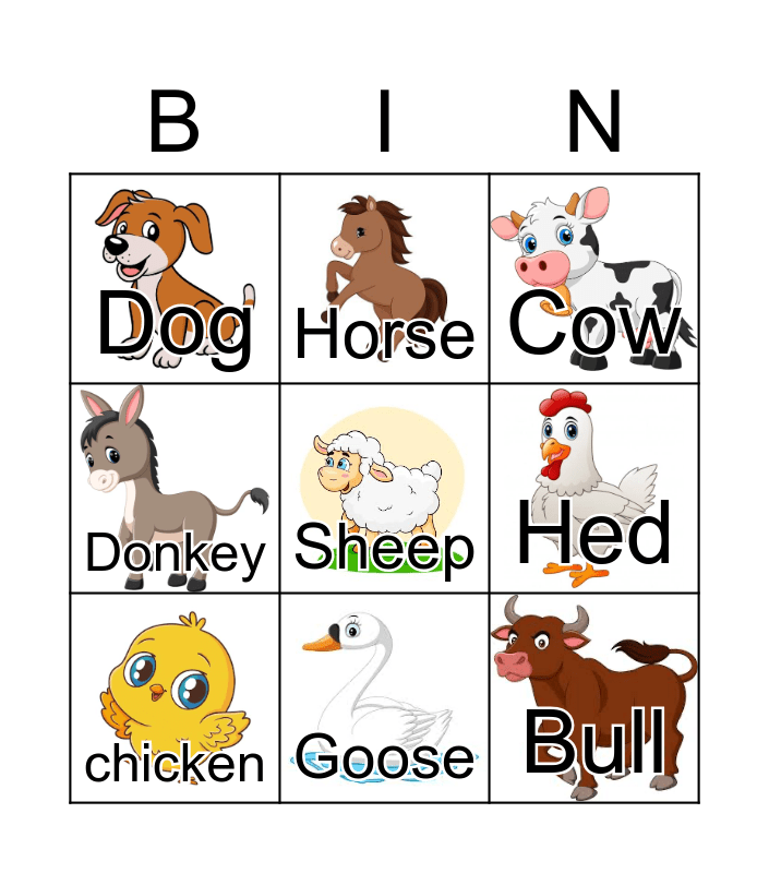 This bingo card has 11 images, a free space and 11 words: Rooster, Goose, Bull, chicken, Horse, Cow, Hed, pig, Donkey, Dog and Turkey.