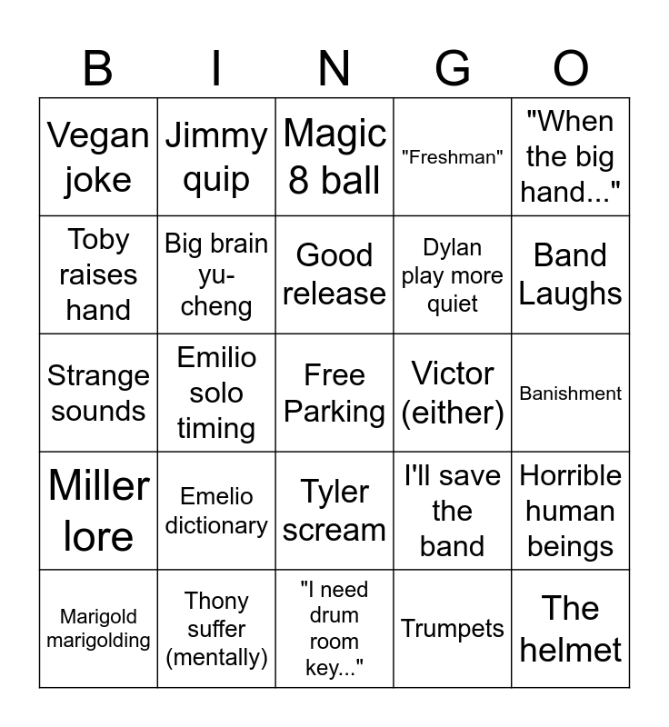 This bingo card has a free space and 24 words: Emelio dictionary, Thony suffer (mentally), Good release, Marigold marigolding, "When the big hand...", Vegan joke, Toby raises hand, Jimmy quip, Victor (either), Tyler scream, Dylan play more quiet, Strange sounds, I'll save the band, Horrible human beings, Big brain yu-cheng, Trumpets, Banishment, Magic 8 ball, Band Laughs, Emilio solo timing, The helmet, Miller lore, "Freshman" and "I need drum room key...".