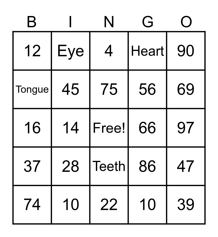 This bingo card has a free space and 29 words: 38, 10, 4, 23, 90, 12, 45, 75, 66, 47, 74, 14, 10, 39, 16, 27, 22, 86, 69, 37, 28, 29, 56, 97, Tongue, Eye, Teeth, Heart and Lungs.
