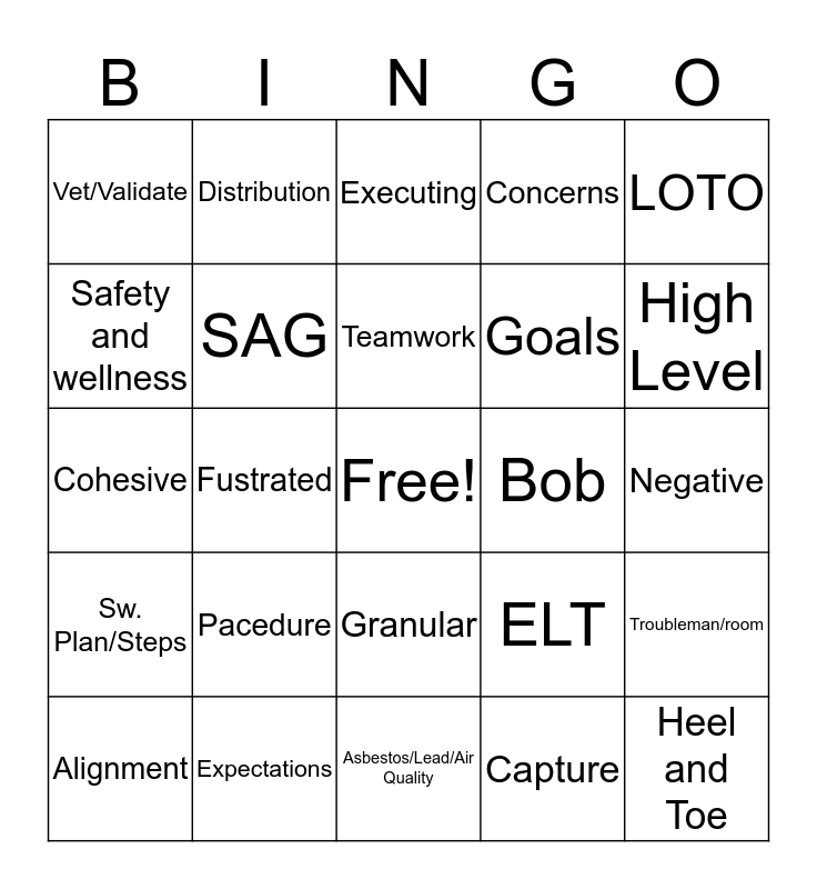 This bingo card has a free space and 24 words: Pacedure, Expectations, Teamwork, Alignment, LOTO, Vet/Validate, Safety and wellness, Distribution, Bob, Granular, Goals, Cohesive, ELT, Troubleman/room, SAG, Capture, Negative, Executing, High Level, Fustrated, Heel and Toe, Sw. Plan/Steps, Concerns and Asbestos/Lead/Air Quality.