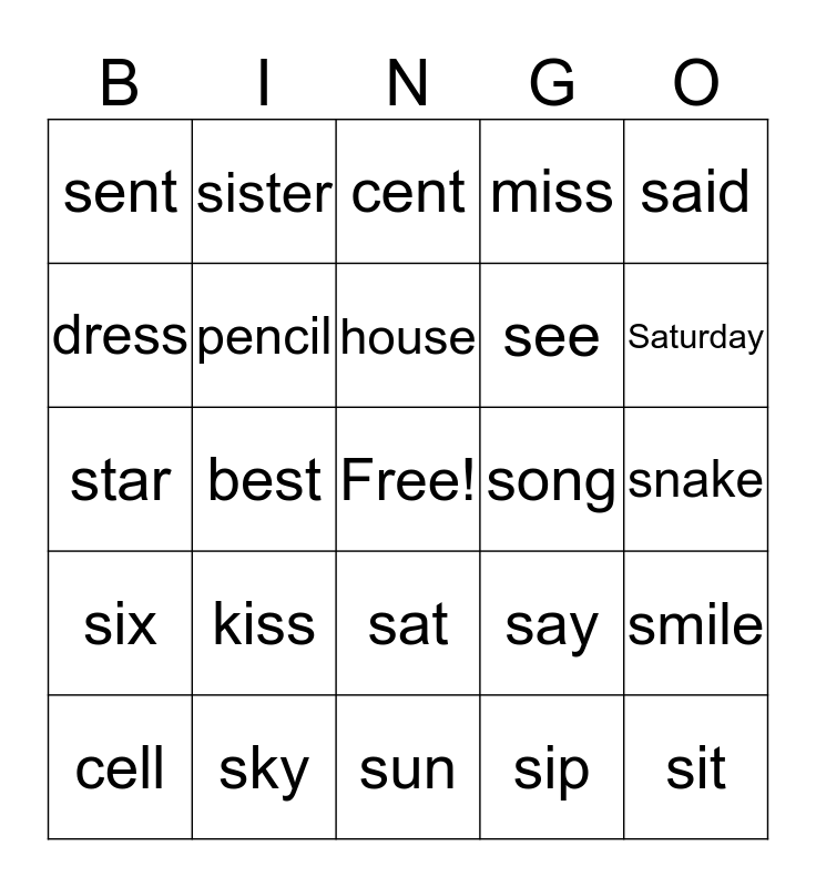 This bingo card has a free space and 24 words: kiss, sky, house, cell, said, sent, dress, sister, song, sat, see, star, say, smile, pencil, sip, snake, cent, Saturday, best, sit, six, miss and sun.