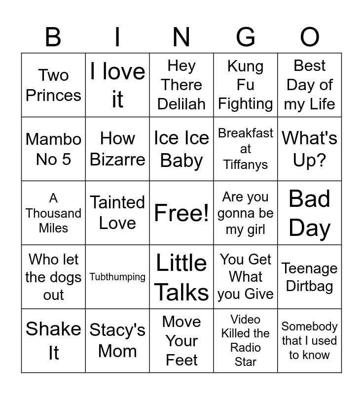 This bingo card has a free space and 24 words: Tubthumping, Stacy's Mom, Ice Ice Baby, Shake It, Best Day of my Life, Two Princes, Mambo No 5, I love it, Are you gonna be my girl, Little Talks, Breakfast at Tiffanys, A Thousand Miles, You Get What you Give, Teenage Dirtbag, How Bizarre, Video Killed the Radio Star, Bad Day, Hey There Delilah, What's Up?, Tainted Love, Somebody that I used to know, Who let the dogs out, Kung Fu Fighting and Move Your Feet.