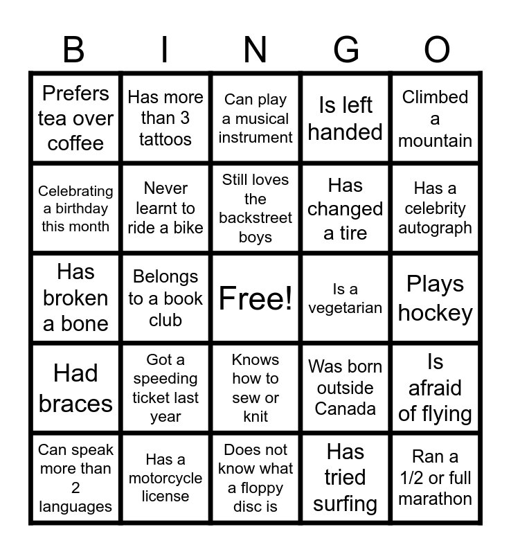 This bingo card has a free space and 24 words: Got a speeding ticket last year, Has a motorcycle license, Still loves the backstreet boys, Can speak more than 2 languages, Climbed a mountain, Prefers tea over coffee, Celebrating a birthday this month, Has more than 3 tattoos, Is a vegetarian, Knows how to sew or knit, Has changed a tire, Has broken a bone, Was born outside Canada, Is afraid of flying, Never learnt to ride a bike, Has tried surfing, Plays hockey, Can play a musical instrument, Has a celebrity autograph, Belongs to a book club, Ran a 1/2 or full marathon, Had braces, Is left handed and Does not know what a floppy disc is.