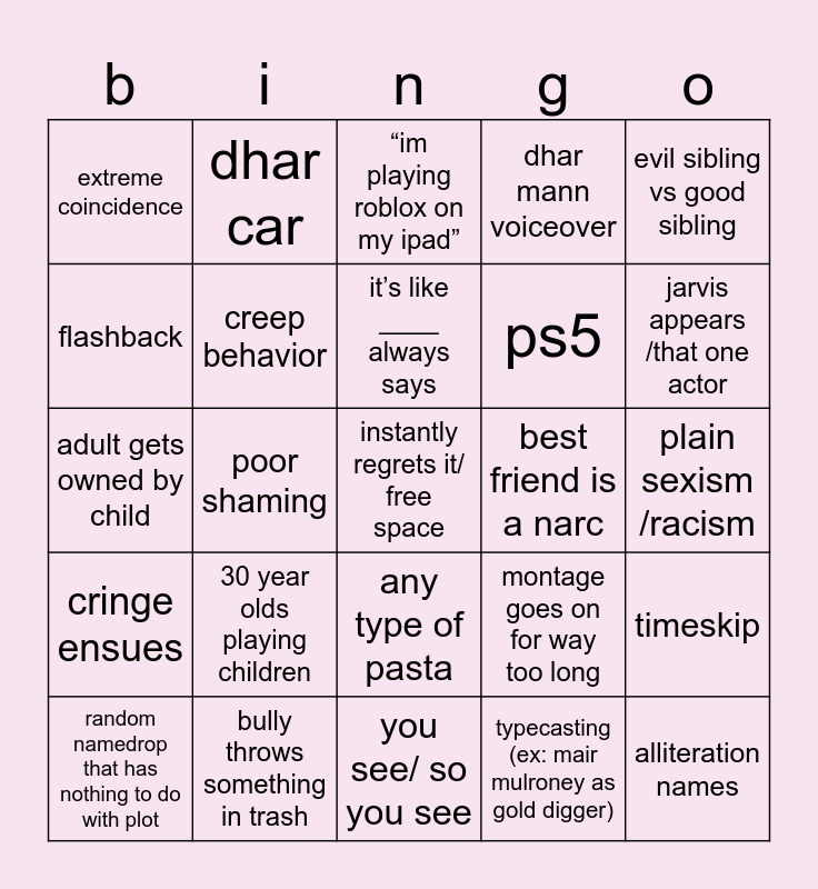 This bingo card has a free space and 29 words: random namedrop that has nothing to do with plot, “genius kid”, poor shaming, evil rich boss man, extreme coincidence, “im playing roblox on my ipad”, creep behavior, 30 year olds playing children, best friend is a narc, bully throws something in trash, plain sexism /racism, alliteration names, you see/ so you see, typecasting (ex: mair mulroney as gold digger), jarvis appears /that one actor, cartoon supervillain, any type of pasta, cringe ensues, evil sibling vs good sibling, adult gets owned by child, montage goes on for way too long, parking lot confrontation, ps5, flashback, dhar mann voiceover, dhar car, timeskip, it’s like ____ always says and continuity error.