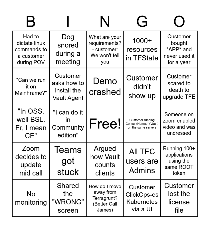 This bingo card has a free space and 65 words: Customer asking "what is monitoring?", Please, monitor CPU usage. Ok, will put top in crontab, Vault unseal keys got lost, Running 100+ applications using the same ROOT token, Had a delivery at the door, Dog barked during a meeting, Dog snored during a meeting, Cat jumped on the keyboard, Demo crashed, Someone enabled my Alexa, Argued how Vault counts clients, Kids rushed into the room, Someone on zoom enabled video and was undressed, Customer bought *APP* and never used it for a year, Have put Workramp on x2 and turned the sound down, "Can we run it on MainFrame?", "I can do it in Community edition", Had to dictate linux commands to a customer during POV, "Er, there's a space before the minus in that ls command", Customer didn't show up, Teams got stuck, Zoom decides to update mid call, 1000+ resources in TFState, Disable SELinux, Customer has a contract with SPECIAL Vault client count, Power went off during the call, Internet went down during the call, Customer had an outage during the call, Customer lost the license file, Production runs on t2 instances, No monitoring, No logs, "We're going to look at backups after we go live", You're on mute!, All TFC users are Admins, Shared the "WRONG" screen, You see your old passwords on a screenshare being used by ex-workmates who became customers, "In OSS, well BSL. Er, I mean CE", Customer ClickOps-es Kubernetes via a UI, single AppRole for all apps. I will save money on clients, Customer asks how to install the Vault Agent, Customer saying, "We don't really need your advice", Customer running Consul+Nomad(+Vault) on the same servers, We don't need TFE. We have a DIY that's better, I love publishing custom providers on TFE, Do you have a secret engine for Minio?, Customer scared to death to upgrade TFE, Got an explicit slack notification about customer while sharing screen, Customer comparing OpenTofu with TFE, instead of TF core binary, Got Vault ACL right on first shot, We don't need TFE Sentinel because we have code review before commit, We don't need module because it is a simple service, We created one module per provider resource, How do I move away from Terragrunt? (Better Call James), I prefer to use MySQL as Vault backend, Default lease 32 days, Default lease 32 days timebomb exploded, What are your requirements? - customer: We won't tell you, PKIception - Customer wanted to use Vault PKI engine to issue Vault's own certificate, 1-node DR cluster to save cost, Embarrassing reply-all to an email, Forgetting your screen is shared with a customer on Zoom and inadvertently sharing the internal Slack chat, where the SE tells to you "cache ton ecran", so you google it but still don't get the message, So you are telling me that your OSS implementation is working perfectly, right? Customer: yes. "And do you still want to hear about the Enterprise?". Customer: yes, but we will continue with OSS..., terraform destroy -auto-approve on the wrong workspace and My GCP project is deleted by doormat 15' before my demo.