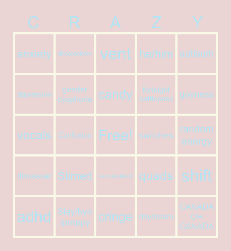 This bingo card has a free space and 24 words: Stimed, Slay/bye /preppy, candy, adhd, autisum, anxiety, depression, dissasociates, switches, overstimulated, fortnight battlepass, vocals, quads, shift, gender dysphoria, daydream, random energy, vent, gayness, Confusion, CANADA OH CANADA, dinosauar, he/him and cringe.