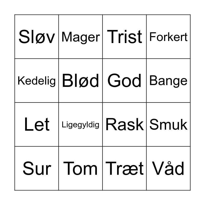 This bingo card has 20 words: Smuk, Langsom, Trist, Snavset, Sur, Kedelig, Tom, Sløv, Let, Mager, Ligegyldig, Rask, Blød, Våd, God, Fattig, Bange, Forkert, Træt and Sidste.
