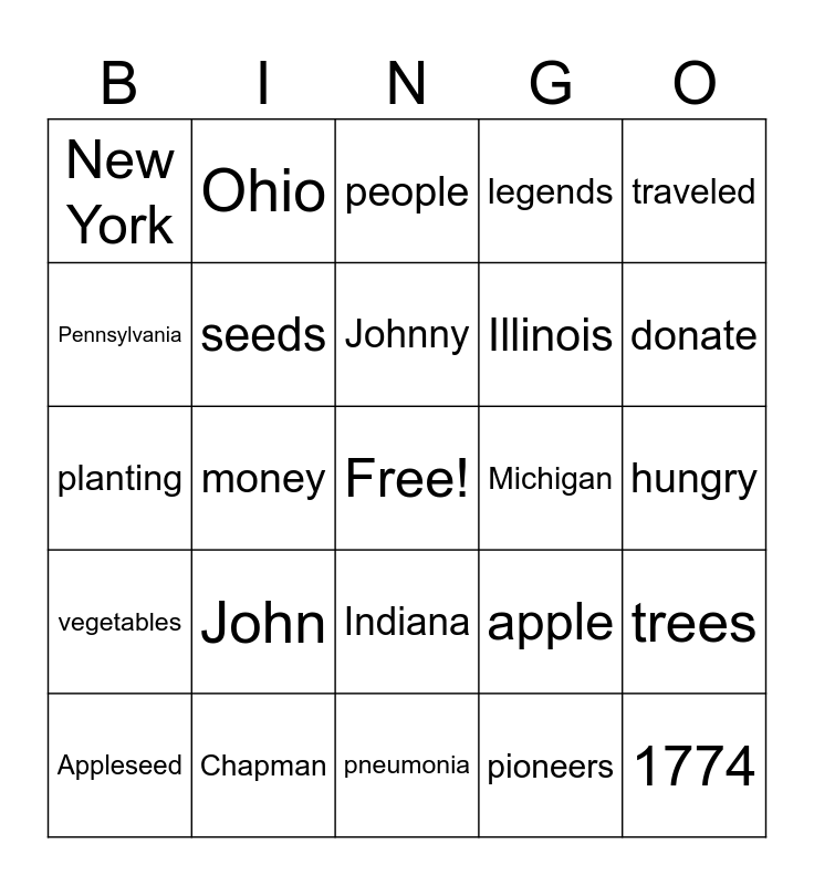 This bingo card has a free space and 24 words: John, Chapman, Johnny, Appleseed, traveled, New York, Pennsylvania, Ohio, Michigan, Indiana, Illinois, planting, apple, trees, seeds, pioneers, hungry, people, donate, money, 1774, vegetables, legends and pneumonia.