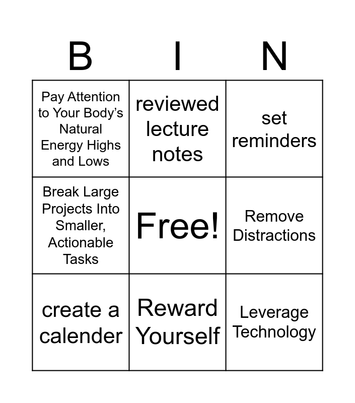 This bingo card has a free space and 9 words: create a calender, set reminders, reviewed lecture notes, Break Large Projects Into Smaller, Actionable Tasks, Pay Attention to Your Body’s Natural Energy Highs and Lows, Remove Distractions, Leverage Technology, ask for help and Reward Yourself.