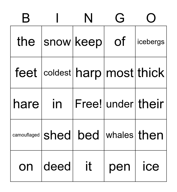 This bingo card has a free space and 57 words: earth, on, is, the, it, place, coldest, freezing, most, land, of, snowy, and, huge, float, water, icebergs, in, swim, ice, under, Beluga, whales, keep, layers, harp, seal, warm, thick, fat, Arctic, foxes, bottom, fur, their, feet, have, hare, to, camouflaged, snow, bed, fed, led, red, wed, shed, deed, need, den, hen, pen, men, ten, when, then and open.