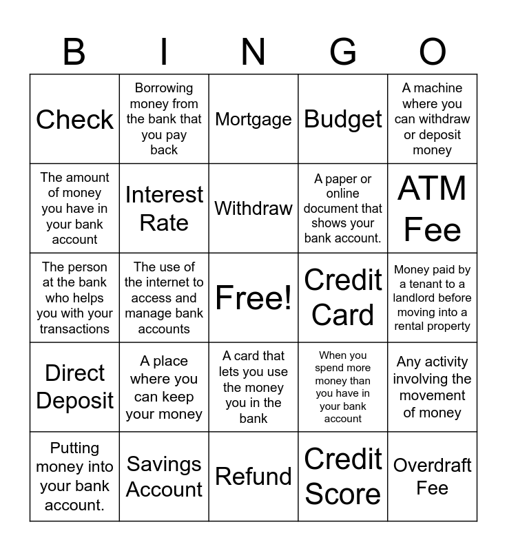 This bingo card has a free space and 24 words: A place where you can keep your money, Savings Account, Withdraw, Putting money into your bank account., A machine where you can withdraw or deposit money, Check, The amount of money you have in your bank account, Borrowing money from the bank that you pay back, Credit Card, A card that lets you use the money you in the bank, A paper or online document that shows your bank account., The person at the bank who helps you with your transactions, When you spend more money than you have in your bank account, Any activity involving the movement of money, Interest Rate, Credit Score, Money paid by a tenant to a landlord before moving into a rental property, Mortgage, ATM Fee, The use of the internet to access and manage bank accounts, Overdraft Fee, Direct Deposit, Budget and Refund.