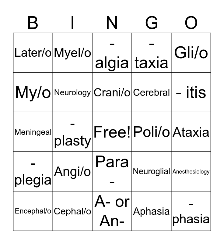 This bingo card has a free space and 24 words: Angi/o, Cephal/o, Crani/o, Encephal/o, Gli/o, Later/o, My/o, Myel/o, Poli/o, Para -, Cerebral, Meningeal, Neuroglial, Anesthesiology, Neurology, Aphasia, Ataxia, - algia, - itis, - plasty, - phasia, - plegia, - taxia and A- or An-.