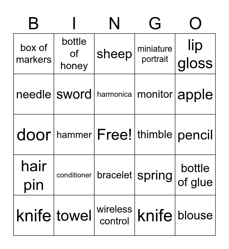 This bingo card has a free space and 25 words: conditioner, wireless control, harmonica, knife, lip gloss, box of markers, needle, bottle of honey, thimble, bracelet, monitor, door, spring, bottle of glue, sword, sun glasses, pencil, sheep, apple, hammer, blouse, towel, hair pin, miniature portrait and knife.