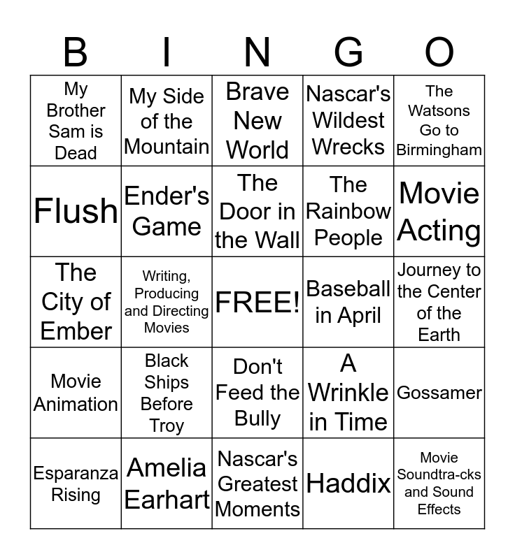 This bingo card has a free space and 24 words: Black Ships Before Troy, Amelia Earhart, The Door in the Wall, Esparanza Rising, The Watsons Go to Birmingham, My Brother Sam is Dead, Flush, My Side of the Mountain, Baseball in April, Don't Feed the Bully, The Rainbow People, The City of Ember, A Wrinkle in Time, Gossamer, Ender's Game, Haddix, Journey to the Center of the Earth, Brave New World, Movie Acting, Writing, Producing and Directing Movies, Movie Soundtra-cks and Sound Effects, Movie Animation, Nascar's Wildest Wrecks and Nascar's Greatest Moments.