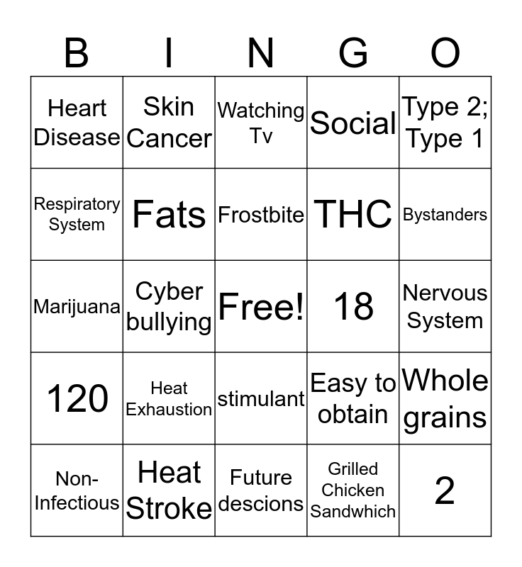 This bingo card has a free space and 24 words: Heat Exhaustion, Heat Stroke, Frostbite, Non-Infectious, Type 2; Type 1, Heart Disease, Respiratory System, Skin Cancer, 18, stimulant, THC, Marijuana, Easy to obtain, Whole grains, Fats, Grilled Chicken Sandwhich, Nervous System, Watching Tv, Bystanders, Cyber bullying, 2, 120, Social and Future descions.