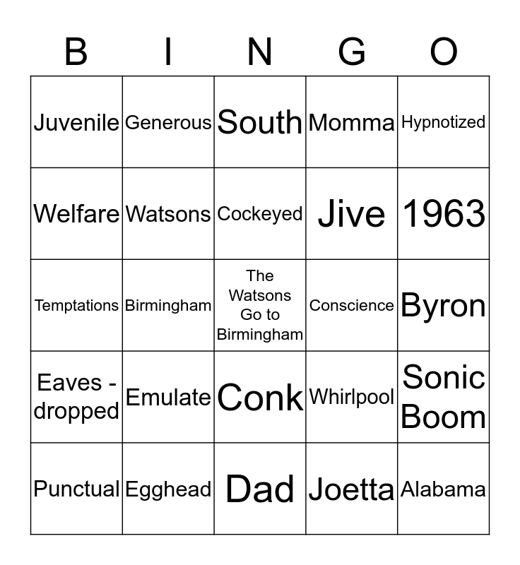 This bingo card has a free space and 24 words: Emulate, Egghead, Cockeyed, Punctual, Hypnotized, Juvenile, Welfare, Generous, Conscience, Conk, Jive, Temptations, Whirlpool, Sonic Boom, Watsons, Joetta, Byron, South, 1963, Birmingham, Alabama, Eaves - dropped, Momma and Dad.