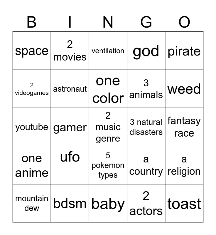 This bingo card has a free space and 24 words: ufo, bdsm, one color, mountain dew, pirate, space, 2 videogames, 2 movies, 3 natural disasters, 5 pokemon types, 3 animals, youtube, a country, a religion, astronaut, 2 actors, fantasy race, ventilation, weed, gamer, toast, one anime, god and baby.