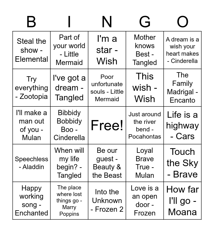 This bingo card has a free space and 47 words: Something that I want - Tangled, How far I'll go - Moana, Surface Pressure - Encanto, Into the Unknown - Frozen 2, When will my life begin? - Tangled, Let it go - Frozen, Part of your world - Little Mermaid, For the first time in forever - Frozen, Try everything - Zootopia, Show yourself - Frozen 2, I've got a dream - Tangled, Mother knows Best - Tangled, Touch the Sky - Brave, Loyal Brave True - Mulan, I wont say - Hercules, All is found - Frozen 2, Poor unfortunate souls - Little Mermaid, Just around the river bend - Pocahontas, Colors of the wind - Pocahontas, A dream is a wish your heart makes - Cinderella, Bibbidy Bobbidy Boo - Cinderella, Love is a an open door - Frozen, Steal the show - Elemental, This wish - Wish, If only - Decendants, The Family Madrigal - Encanto, Happy working song - Enchanted, Just cant wait to be king - Lion King, Be our guest - Beauty & the Beast, Speechless - Aladdin, Nobody like u - Turning Red, All I want - High School Musical, Remember Me - Coco, One way or another - Hocus Pocus 2, A whole new world - Alladin, The place where lost things go - Marry Poppins, Life is a highway - Cars, Hakuna Matata - Lion King, Come on out - Zombies 3, The Aristocats - Aristocats, If I didn't have you - Monsters Inc., I'm a star - Wish, I'll make a man out of you - Mulan, Hawaiian Roller Coaster Ride - Lili & Stitch, When you wish up a star - Pinocchio, Some day my prince will come - Snow White and The Rose Song - High school Musical.