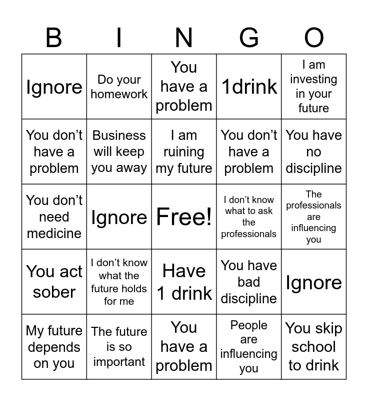 This bingo card has a free space and 24 words: I don’t know what the future holds for me, The future is so important, I am ruining my future, My future depends on you, I am investing in your future, Ignore, You don’t have a problem, Do your homework, I don’t know what to ask the professionals, Have 1 drink, You don’t have a problem, You don’t need medicine, You have bad discipline, Ignore, Business will keep you away, People are influencing you, The professionals are influencing you, You have a problem, You have no discipline, Ignore, You skip school to drink, You act sober, 1drink and You have a problem.