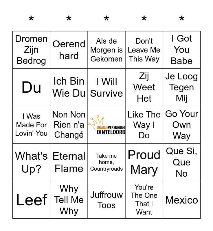 This bingo card has a free space and 81 words: Africa, Alles Kan Een Mens Gelukkig Maken, Als de Morgen is Gekomen, Angels, Are You Gonna Go My Way, Atemlos Durch Die Nacht, Bad Romance, België, Belle Helene, Clocks, Dancing In The Dark, Dancing Queen, Don't Leave Me This Way, Dromen Zijn Bedrog, Dromendans, Du, Engelbewaarder, Eternal Flame, Even Aan Mijn Moeder Vragen, Go Your Own Way, Huisje op Wielen, I Got You Babe, I Was Made For Lovin' You, I Will Survive, Ich Bin Wie Du, Ik Ga Zwemmen, Ik Heb De Hele Nacht Liggen Dromen, Ik Heb Zo Waanzinnig Gedroomd, Ik Voel Me Zo Verdomd Alleen, It's Raining Men, Je Loog Tegen Mij, Jolene, Juffrouw Toos, Kom Van Dat Dak Af, Leef, Like The Way I Do, Living on a Prayer, Love Me Just A Little Bit More, Malle Babbe, Met De Vlam In De Pijp, Mexico, My Heart Will Go on, Never Alone, No Matter What, Non Non Rien n'a Changé, Noodgeval, Oerend hard, Ons Moeder Zeej Nog, Oya Lélé, Piano Man, Proud Mary, Que Si, Que No, Rainbow In The Sky, Rio, Rivers Of Babylon, Smells Like Teen Spirit, Stayin Alive, Summer Of '69, Sweet Caroline, t Dondert en 't Bliksemt, Take me home, Countryroads, Take on Me, The Look, The Reflex, Thunderstruck, Totally Clips Of The Heart, Twilight Zone, Una Paloma Blanca, Unwritten, Verdammt, ich lieb Dich, Wake Me Up Before You Go Go, What's Up?, Why Tell Me Why, Wonderfull Days, Y.M.C.A., Year of Summer, You Never Walk Alone, You're The One That I Want, Zeg Maar Niets Meer, Zij Weet Het and Zo Stil In Mij.
