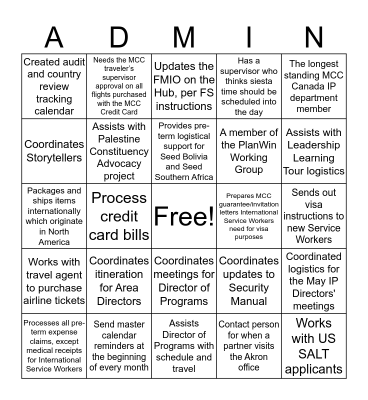 This bingo card has a free space and 24 words: Coordinates itineration for Area Directors, Send master calendar reminders at the beginning of every month, Provides pre-term logistical support for Seed Bolivia and Seed Southern Africa, Processes all pre-term expense claims, except medical receipts for International Service Workers, The longest standing MCC Canada IP department member, Created audit and country review tracking calendar, Coordinates Storytellers, Needs the MCC traveler’s supervisor approval on all flights purchased with the MCC Credit Card, Prepares MCC guarantee/invitation letters International Service Workers need for visa purposes, Coordinates meetings for Director of Programs, A member of the PlanWin Working Group, Packages and ships items internationally which originate in North America, Coordinates updates to Security Manual, Coordinated logistics for the May IP Directors' meetings, Assists with Palestine Constituency Advocacy project, Contact person for when a partner visits the Akron office, Sends out visa instructions to new Service Workers, Updates the FMIO on the Hub, per FS instructions, Assists with Leadership Learning Tour logistics, Process credit card bills, Works with US SALT applicants, Works with travel agent to purchase airline tickets, Has a supervisor who thinks siesta time should be scheduled into the day and Assists Director of Programs with schedule and travel.