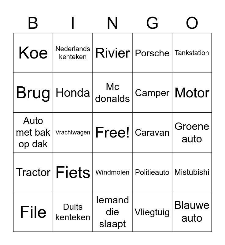 This bingo card has a free space and 24 words: Fiets, Duits kenteken, Mc donalds, File, Tankstation, Koe, Brug, Nederlands kenteken, Caravan, Windmolen, Camper, Auto met bak op dak, Politieauto, Mistubishi, Honda, Vliegtuig, Groene auto, Rivier, Motor, Vrachtwagen, Blauwe auto, Tractor, Porsche and Iemand die slaapt.