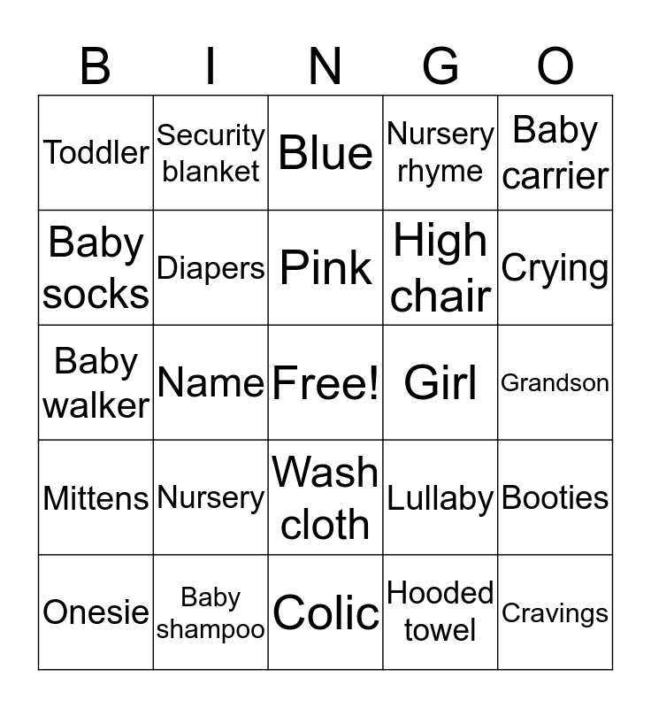 This bingo card has a free space and 40 words: Sippy cup, Baby walker, Love, Diapers, Baby shampoo, Wash cloth, Pink, Ultrasound, Baby carrier, Mittens, Name, Nursery rhyme, Cravings, Grandson, Girl, Nursery, Bath time, Toddler, Baby powder, Blue, Booties, Hooded towel, High chair, Baby socks, Pacifier, basket, Layette, Teether, Granddaugther, cloth, Baby cardigan, Onesie, Carrycot, Lullaby, Crying, Colic, Mobiles, Stork, Security blanket and Cradle.