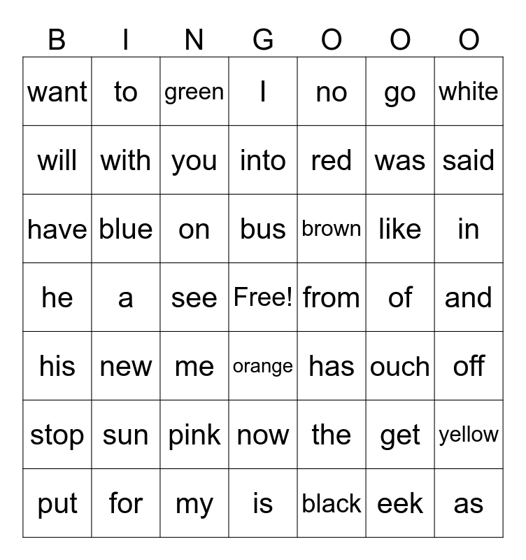This bingo card has a free space and 48 words: the, was, is, a, on, and, to, for, go, orange, white, I, like, brown, stop, of, will, said, get, no, red, see, want, with, yellow, you, in, put, bus, blue, eek, from, off, sun, he, has, ouch, have, me, pink, his, as, green, my, into, now, new and black.