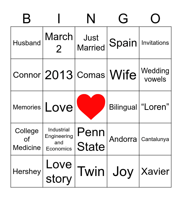 This bingo card has a free space and 47 words: Lauren, Xavier, Albert, Twin, Industrial Engineering and Economics, 1996, March 2, June 1, Connor, 2024, 2013, Spain, Cantalunya, Andorra, Echols, Botanical Gardens, Comas, Bilingual, Day trader, Invitations, Love, Joy, Husband, Wife, I DO, Wedding vowels, Hershey, Lloret de Mar, Penn State, College of Medicine, Chicago, Spanish and Psychology, OBGYN, Blue eyes, Long distance, Love story, “Loren”, Bridal Gown, Wedding Cake, Bouquet, Guests, Just Married, Memories, Bride, Groom, Family and Friends.
