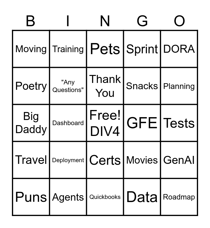 This bingo card has a free space and 29 words: Puns, Duck, Dashboard, Proposals, Moving, Pets, "Any Questions", Deployment, GFE, Agents, Tests, Roadmap, Quickbooks, Data, Planning, Features, Certs, Travel, DORA, Big Daddy, Movies, Sports, Snacks, Poetry, Sprint, Training, GenAI, Thank You and Pairing.