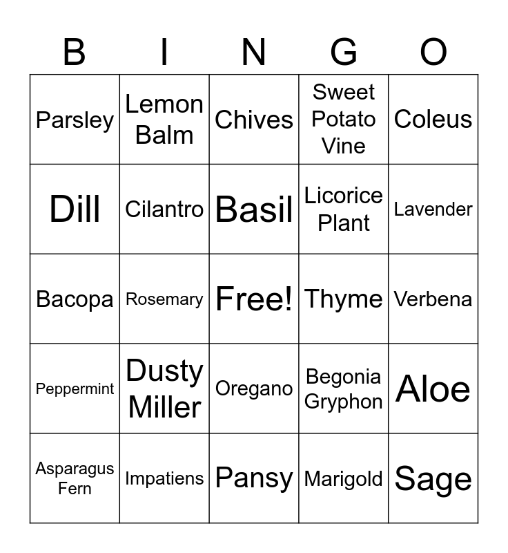 This bingo card has a free space and 24 words: Dusty Miller, Impatiens, Basil, Asparagus Fern, Coleus, Parsley, Dill, Lemon Balm, Thyme, Oregano, Licorice Plant, Bacopa, Begonia Gryphon, Aloe, Cilantro, Marigold, Verbena, Chives, Lavender, Rosemary, Sage, Peppermint, Sweet Potato Vine and Pansy.