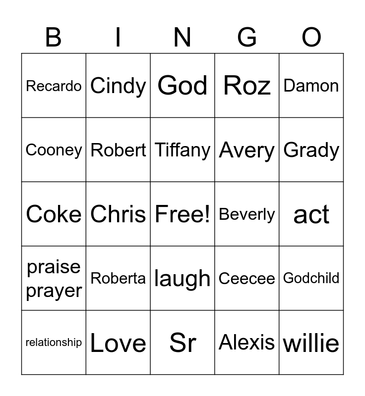 This bingo card has a free space and 52 words: Sam, willie, Broadwater, Sr, Roberta, Mims, Cindy, David, Cooney, Mealing, Robert, Ruby, Godchild, Ceecee, Matt, Hosea, Tiffany, Beverly, Earl, Damon, Chris, Alexis, Recardo, Avery, Wendell, Faith, Joel, Diane, Grady, Elijah, Tobias, Roz, Punk, Justin, Austin, God, Love, church, cook, Zion, sing, act, praise prayer, trips, laugh, cry, holidays, Coke, housekeeper, van, relationship and fun.