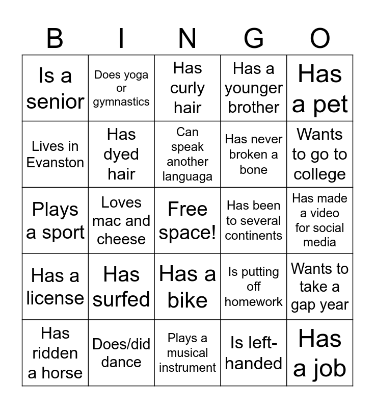 This bingo card has a free space and 24 words: Has surfed, Does/did dance, Can speak another languaga, Has ridden a horse, Has a pet, Is a senior, Lives in Evanston, Does yoga or gymnastics, Has been to several continents, Has a bike, Has never broken a bone, Plays a sport, Is putting off homework, Wants to take a gap year, Has dyed hair, Is left-handed, Has made a video for social media, Has curly hair, Wants to go to college, Loves mac and cheese, Has a job, Has a license, Has a younger brother and Plays a musical instrument.