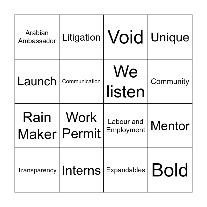 This bingo card has 43 words: Free!, Transparency, Rive, Locus Standi, Corporate, Peace Crafters, Void, CoSec, Launch, Associate, Unique, Interns, Coffee Addicts, Tea Lovers, Different, Business Development, High Court, Labour and Employment, Business Visa, Work Permit, Litigation, Case Update, Running Lawyer, Arabian Ambassador, The Alchemist, Expandables, The Agents, One on One, Alliot Global Alliances, Bold, We Listen, Reach, Awesome Team, Mentor, Swagger Space, Committed, Play, Community, Communication, Rain Maker, Call back in 24 hours!, We listen and Morning Meetings.