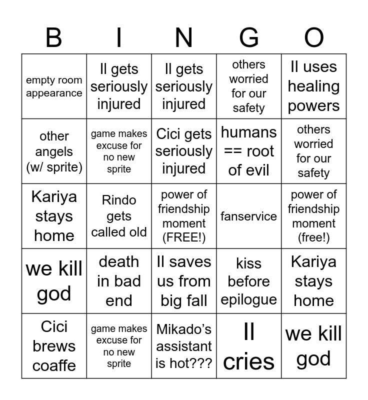 This bingo card has a free space and 49 words: Mysir: “I’m just a destroyer”, we kill god, Otomate game reference, Mikado’s assistant is hot???, death in bad end, Il saves us from big fall, Il gets seriously injured, Il has a different form, other angels (w/ sprite), forceful isekai into Il’s world, game makes excuse for no new sprite, others worried for our safety, Kariya stays home, kiss before epilogue, Ignis telling Il to go outside, Cici brews coaffe, Cici gets seriously injured, fanservice, uninvited guest / intruder, Il uses healing powers, Rindo gets called old, Il cries, empty room appearance, humans == root of evil, Otomate game reference, others worried for our safety, Cici brews coaffe, kiss before epilogue, Il saves us from big fall, we kill god, Il cries, other angels (w/ sprite), Cici gets seriously injured, Rindo gets called old, game makes excuse for no new sprite, uninvited guest / intruder, humans == root of evil, Il uses healing powers, power of friendship moment (free!), fanservice, Mysir: “I’m just a destroyer”, death in bad end, forceful isekai into Il’s world, Il has a different form, Kariya stays home, Il gets seriously injured, Mikado’s assistant is hot???, empty room appearance and Ignis telling Il to go outside.