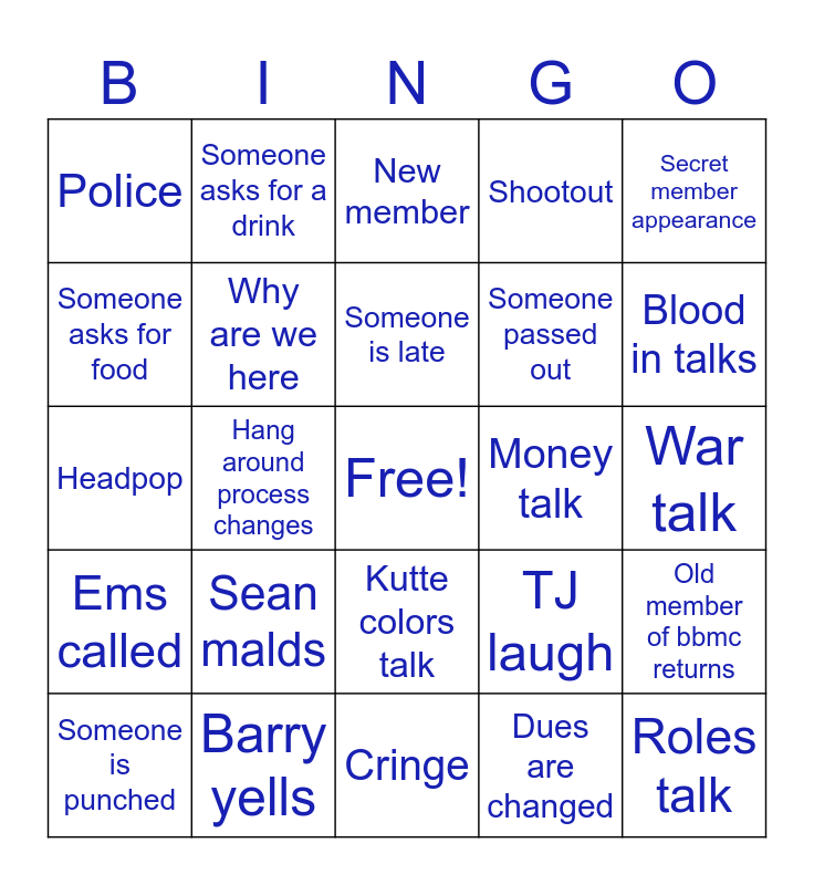 This bingo card has a free space and 24 words: Sean malds, Barry yells, Someone is late, Someone is punched, Secret member appearance, Police, Someone asks for food, Someone asks for a drink, Money talk, Kutte colors talk, Someone passed out, Headpop, TJ laugh, Old member of bbmc returns, Why are we here, Dues are changed, War talk, New member, Blood in talks, Hang around process changes, Roles talk, Ems called, Shootout and Cringe.