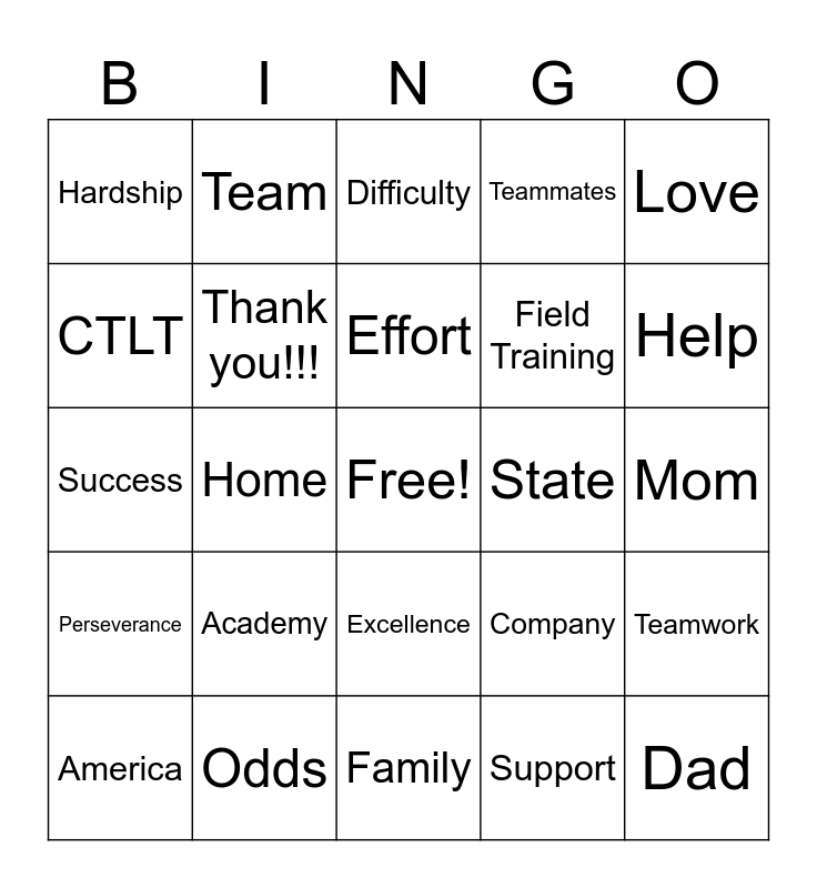 This bingo card has a free space and 29 words: America, The Flag, Home, Adversity, Hardship, Difficulty, Thank you!!!, Academy, State, Odds, Mom, Dad, Family, Support, Help, Army, Excellence, Perseverance, Love, Success, Company, Academics, Field Training, CTLT, Teammates, Team, Teamwork, Effort and Heart.