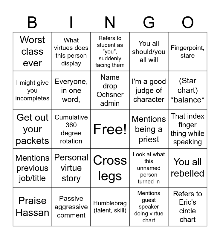 This bingo card has a free space and 24 words: Personal virtue story, Passive aggressive comment, Name drop Ochsner admin, Praise Hassan, Fingerpoint, stare, Worst class ever, I might give you incompletes, What virtues does this person display, Mentions being a priest, Cross legs, I'm a good judge of character, Get out your packets, Look at what this unnamed person turned in, You all rebelled, Everyone, in one word,, Mentions guest speaker doing virtue chart, That index finger thing while speaking, Refers to student as "you", suddenly facing them, (Star chart) *balance*, Cumulative 360 degree rotation, Refers to Eric's circle chart, Mentions previous job/title, You all should/you all will and Humblebrag (talent, skill).