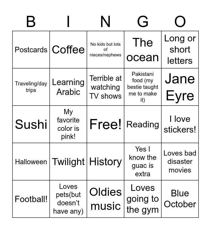 This bingo card has a free space and 24 words: Twilight, Loves pets(but doesn’t have any), Terrible at watching TV shows, Football!, Long or short letters, Postcards, Traveling/day trips, Coffee, Reading, History, Pakistani food (my bestie taught me to make it), Sushi, Yes I know the guac is extra, Loves bad disaster movies, Learning Arabic, Loves going to the gym, I love stickers!, No kids but lots of nieces/nephews, Jane Eyre, My favorite color is pink!, Blue October, Halloween, The ocean and Oldies music.