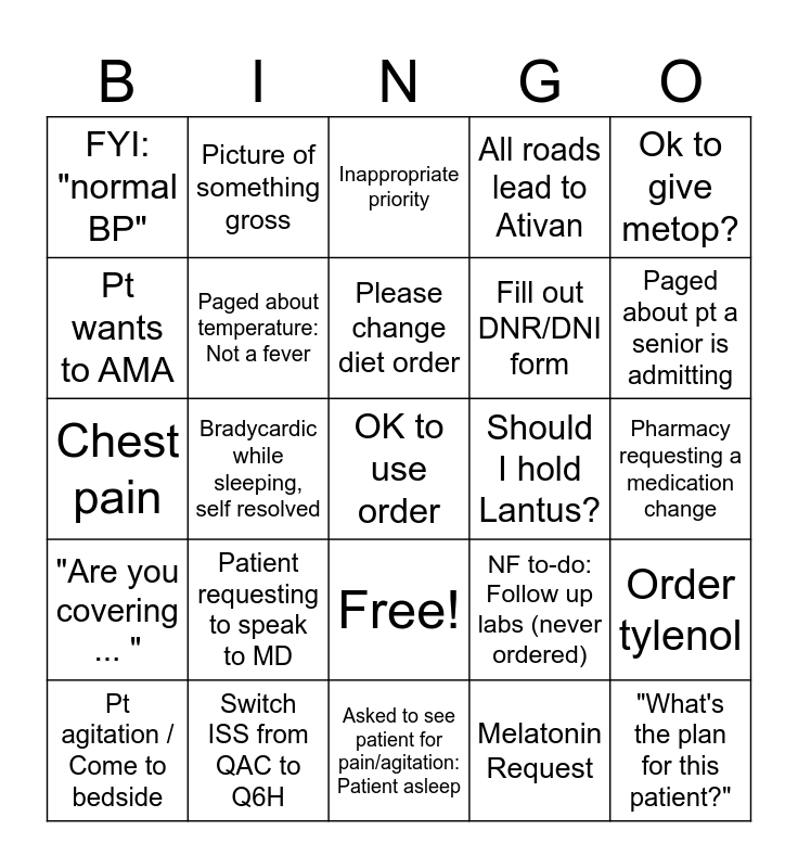 This bingo card has 26 words: Free!, Melatonin Request, Please change diet order, Switch ISS from QAC to Q6H, Ok to give metop?, FYI: "normal BP", Pt wants to AMA, Picture of something gross, Pharmacy requesting a medication change, NF to-do: Follow up labs (never ordered), Fill out DNR/DNI form, Chest pain, Order tylenol, Pt agitation / Come to bedside, Bradycardic while sleeping, self resolved, FYI: O2 desat while sleeping, All roads lead to Ativan, "Are you covering ... ", Inappropriate priority, OK to use order, Paged about pt a senior is admitting, Asked to see patient for pain/agitation: Patient asleep, Should I hold Lantus?, Patient requesting to speak to MD, Paged about temperature: Not a fever and "What's the plan for this patient?".