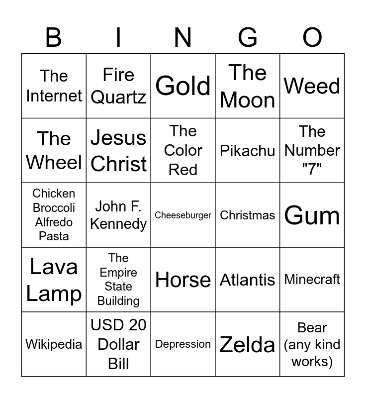 This bingo card has a free space and 24 words: The Empire State Building, USD 20 Dollar Bill, The Color Red, Wikipedia, Weed, The Internet, The Wheel, Fire Quartz, Christmas, Horse, Pikachu, Chicken Broccoli Alfredo Pasta, Atlantis, Minecraft, Jesus Christ, Zelda, Gum, Gold, The Number "7", John F. Kennedy, Bear (any kind works), Lava Lamp, The Moon and Depression.