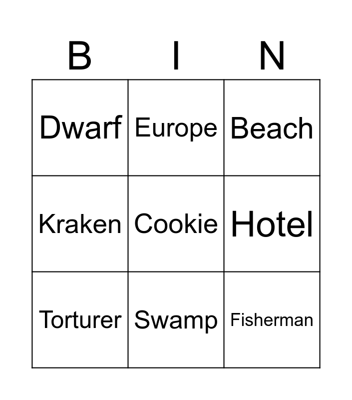 This bingo card has a free space and 8 words: Hotel, Beach, Europe, Torturer, Dwarf, Fisherman, Kraken and Swamp.