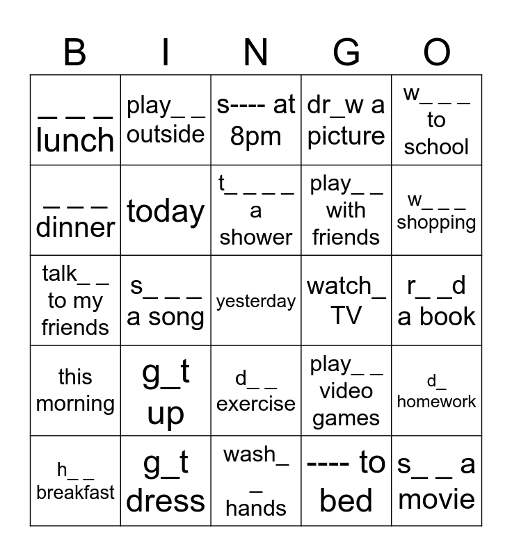 This bingo card has a free space and 24 words: g_t up, g_t dress, t_ _ _ _ a shower, h_ _ breakfast, w_ _ _ to school, _ _ _ lunch, _ _ _ dinner, play_ _ outside, watch_ TV, d_ _ exercise, play_ _ with friends, talk_ _ to my friends, play_ _ video games, d_ homework, today, ---- to bed, r_ _d a book, s---- at 8pm, w_ _ _ shopping, s_ _ _ a song, s_ _ a movie, this morning, dr_w a picture and wash_ _ hands.