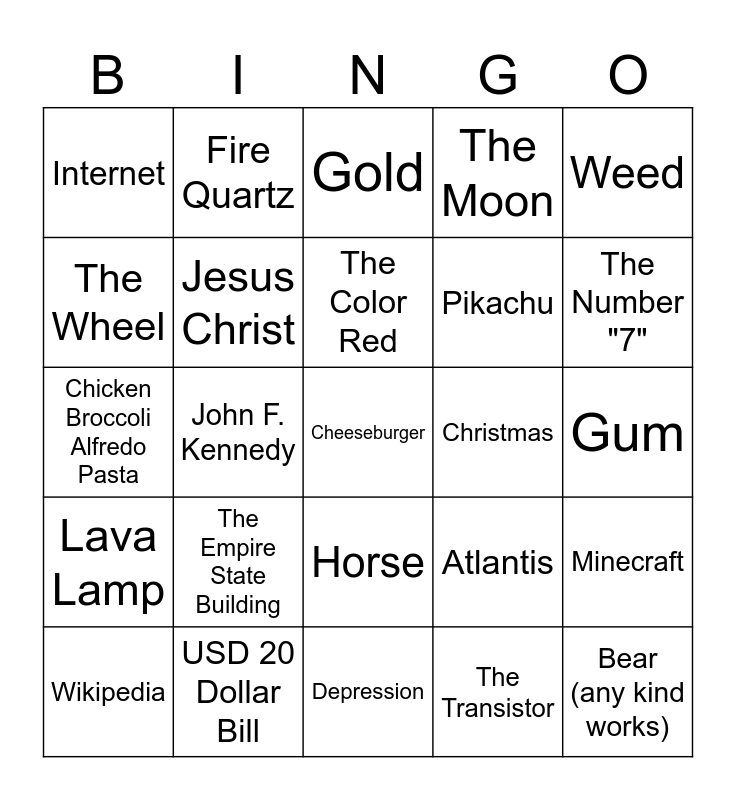 This bingo card has a free space and 24 words: The Empire State Building, USD 20 Dollar Bill, The Color Red, Wikipedia, Weed, Internet, The Wheel, Fire Quartz, Christmas, Horse, Pikachu, Chicken Broccoli Alfredo Pasta, Atlantis, Minecraft, Jesus Christ, The Transistor, Gum, Gold, The Number "7", John F. Kennedy, Bear (any kind works), Lava Lamp, The Moon and Depression.